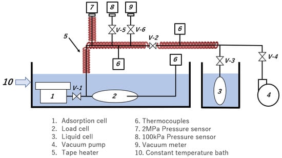 Here, we placed the adsorption cell (1) and the load cell (2), in Figure 3, in a constant-temperature bath while we implemented the liquid cell (3) for charging of the refrigerant. The temperature of the bath in the case of the Liquid cell (3) was regulated using a constant temperature circulator (CTP-3000, EYELA Co., Ltd., Tokyo, Japan) to control the initial charging pressure of the refrigerant (adsorbate). The actual charging pressure of the refrigerant (adsorbate) was regulated by adjusting the control valve (V-3). A ribbon heater (E16, Sakaguchi E.H VOC, Tokyo, Japan) was utilized to maintain the tube temperature at a constant temperature of about 5 °C above the saturation point at the given isothermal conditions. Before starting the measurement, the experimental system was thoroughly evacuated for around 12 h to ascertain constant initial conditions for each isothermal experiment.