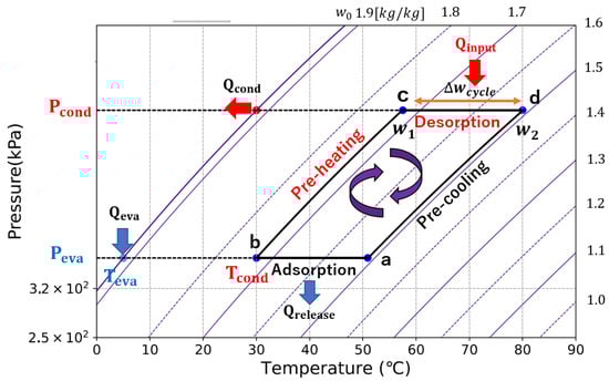 Formerly, Cacciola et al. [53] expressed the detailed thermodynamic processes of the ideal adsorption cycle, and this ideal approach of a single bed adsorption cycle configuration is also shown for our intended system in Figure 4 by the solid line. It consists of four sequential thermodynamic processes: I. Pre-heating (b–c), II. Desorption (c–d), III. Pre-cooling (d–a), and IV. Adsorption (a–b). Qinput is the heat supply to the adsorption bed heat exchanger, and it is used for heating the bed during the desorption process. Qcond is the heat released in the condenser, Qout is the heat produced during the adsorption process extracted from the bed, and Qeva is the heat supply to the evaporator during evaporation of the adsorbate.