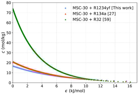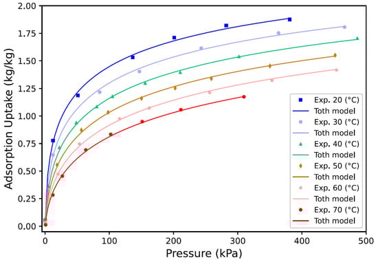 Currently, the Toth model and the D–A model are possibly the most applied models for refrigerants/activated carbon systems and used for adsorption isotherm analysis thanks to their accuracy and simplicity. However, the Freundlich, Langmuir, and D–R models are also still being used due to their historical development and the fact that they can provide, together with the current models, some additional insight based on the relevant adsorption theories. From the perspective of classical models’ accuracy, the empirical Freundlich model offers 8.53% error for MSC-30/R134a and a virtually identical 8.52% error for the MSC-30/R1234yf pair, while the simple Langmuir model offers 6.53% error for MSC-30/R134a and 8.92% error for MSC-30/R1234yf. In comparison with the conventional Toth model, these fitting errors are about two times higher for MSC-30/R134a, and more than five times higher for MSC-30/R1234yf, while the actual fit error values for the Toth model are as low as 3.06% and 1.66%, respectively. The fitting of the Toth model for MSC-30/R1234yf is shown in Figure 6.