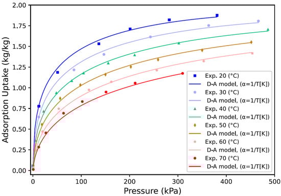 In Equations (15) and (16), is once more the specific uptake at the equilibrium expressed in kg/kg, and and are the maximum uptake and maximum volumetric uptake in kg/kg and m3/kg, respectively. Finally, the E is the adsorption energy and n is similar to the Toth equation the heterogeneity factor. It is worth noting that once the heterogeneity factor becomes n = 2, the D–A isotherm formally becomes the D–R isotherm. Then, both of the models practically share the same adsorption potential ε dependent on the natural logarithm of the inversed relative pressure: