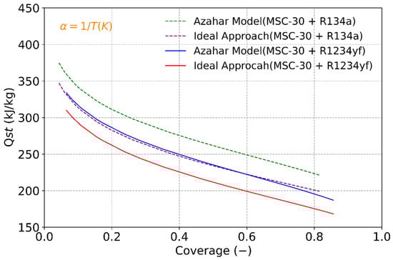 Finally, combining Equation (21) with Equation (23) and after some algebraic manipulation, the ideal approach for the heat of adsorption is obtained in Equation (24):