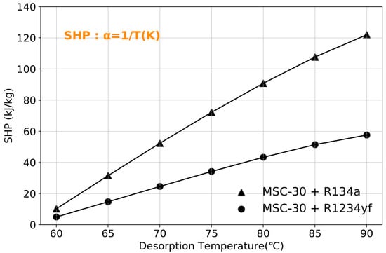 Heat input of the cycle is the same as for the cooling mode; however, in the heating mode, instead of specific cooling power (SCP) (kJ/kg), specific heating power (SHP) (kJ/kg) is used for the calculation. The following Equations show the calculation of the SHP: