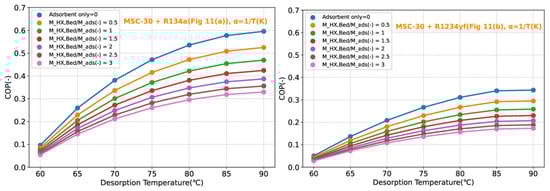 The latent heat QLat in Equation (32) is simply calculated as a function of the adsorption heat qst in the working range of the desorption temperature Tdes and pre-heating temperature TPh under the given pressure conditions Pcond. The sensible heat QSen is then calculated as the addition of heat contained by all major parts in the working temperature range. Given the unity factor of the specific heat of the adsorber cp,ads used in the generalized calculation, the heat contained by the heat exchanger can be expressed directly as the ratio to the adsorbed amount MHX,Bed/Mads combined with the specific heat of the adsorption bed material. Finally, the amount of previously adsorbed refrigerant is accounted for as well through its specific heat cp,a and specific adsorption amount function w(T,P), which is based on the adsorption isotherm modeling.