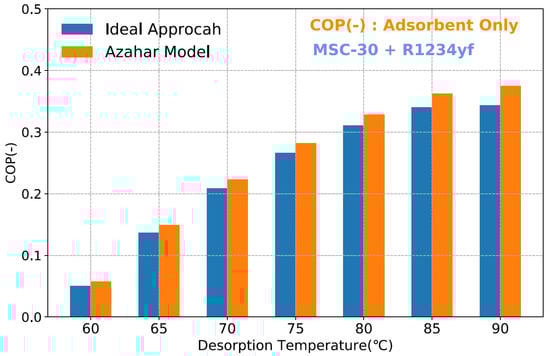 The potential of a typical adsorbent–adsorbate pair is often assessed using an equilibrium cycle analysis when the adsorption isotherm data are available. The equilibrium cycle analysis is a quick methodology to compare the cycle performance of various working pairs and useful for the working pair selection. An important parameter that is sometimes overlooked in such analyzes or not paid proper attention to is the effect of thermal mass. Gluesenkam et al. [28] have recently pointed out that the thermal masses of individual components can considerably influence many adsorption heat pump systems’ performance and should be carefully evaluated. Gluesenkamp et al. [28] utilized three metrics factors: mass ratio, specific thermal mass, and effective specific heat to discuss the influence on the system performance. Given the complexity of the actual adsorption system, it is rather difficult to determine the exact value of the thermal masses for the adsorbent and heat exchanger materials. Nevertheless, the adsorption system’s performance with respect to the thermal mass ratio (adsorbent to heat exchanger mass) will be an important parameter for the working pair selection. Here, we attempted an improved equilibrium cycle analysis considering the thermal mass impacts to comprehensively estimate the performance of selected activated carbon/refrigerant pairs.
