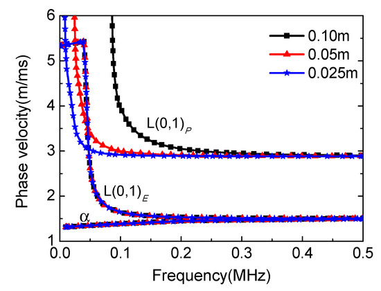 Figure 2 shows that in the frequency range f < 0.5 MHz, the longitudinal modes of the water-filled pipe in infinite porous medium comprise eight modes L(0,m) (m = 1, 2, 3, …, 8) and one α mode. The bottom red line represents the α mode in the liquid of the pipe, whose phase velocity is similar to the Scholte wave, and which increases with frequency and gradually tends to a value of 1500 m/s [12]. The remaining red lines depict the longitudinal guided waves of the water-filled pipe in elastic medium. Each exists in a wide frequency range. More specifically, the axisymmetric longitudinal guided waves exist in numerous modes. There is more than one mode at any frequency, and the characteristics of each mode are unique. The longitudinal guided wave velocities in a water-filled pipe embedded in infinite porous medium decrease as a function of the frequency, and slope downward, approaching the longitudinal wave velocity of the liquid in the pipe [42].