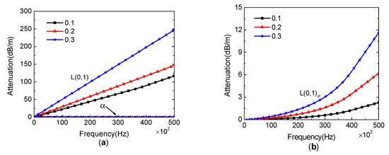 Attenuation as a function of frequency is depicted in Figure 11 for a water-filled pipe embedded in porous medium with different values of porosity, i.e., = 0.1, 0.2, and 0.3. In Figure 11, we plot the attenuation curves of the α and L(0,1) modes. Figure 11a shows that the attenuation of α mode is zero; however, its mode shape is not suited to detection. At low frequencies, its axial displacement is dominant, but the actual set-up is not appropriate for imposing a displacement in the outer medium. At higher frequencies, its axial and radial displacements decrease exponentially from the outer wall, and again, the detection is not suitable to generate this mode. Aristégui and Lowe, in their study of fluid-filled pipes surrounded by different fluids [12], similarly found and discussed that the attenuation curve is zero. The attenuation of L(0,1) increases for higher values of frequency, first rapidly then almost linearly with frequency. The attenuation trends are practically identical for the different values of the porosity. Again, there is very good agreement between the dispersion characteristics and the attenuation. As investigated by Gao et al. [48], for a fluid-filled pipe surrounded by a fluid medium, the attenuation increases as a result of the added radiation damping. As shown in Figure 11a, the radiation damping effect increases with porosity (the water in the porous medium increases with the porosity). At very low frequencies (below 200 Hz), this effect is relatively small, whereas it increases distinguishably at higher frequencies relative to the value at low porosity. A similar phenomenon is observed in the case of the water-filled pipe embedded in finite porous medium from Figure 11b. It can be seen that a finite medium reduces radiation damping to the pipe wall, causing smaller losses [49]. It is observed that the attenuation in the water-filled pipe embedded in a finite porous medium decreases significantly compared to that in an infinite medium, this value being 1.79 dB/m for a finite porous medium and 103.17 dB/m for an infinite porous medium at 0.045 MHz ( = 0.1).