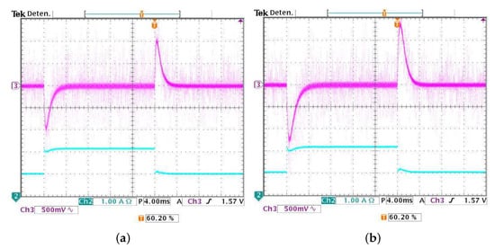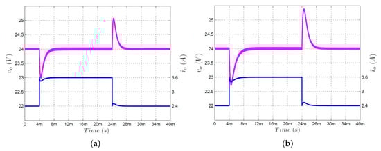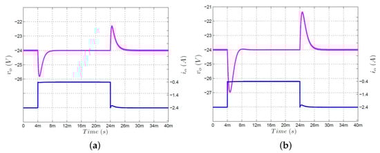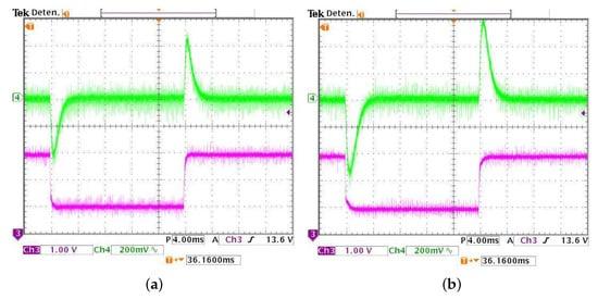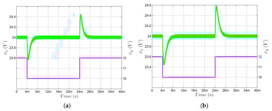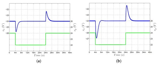 Figure 14a,b show the transient responses of the output voltage in the presence of a A load current disturbance, for the controllers (24) and (26), respectively. These experimental results and the previous simulated waveforms of Figure 8a,b are in very good agreement. The load current changes in the prototype were carried out by means of a voltage-controlled switch, such as shown in the circuit diagram of the converter in Figure 10. Furthermore, It was verified the response of the controllers and to a supply voltage change. The experimental result, shown in Figure 15 accurately verifies the simulations shown in Figure 9.