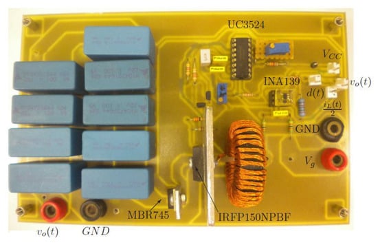 In order to verify the theoretical predictions of the LMI-Fuzzy control and LMI robust control, an experimental prototype of the boost converter has been implemented whose characteristics are shown in Table 3. Figure 10 shows the circuit diagram of the prototype with the feedback structure that was used for the LMI-Fuzzy control, where it can be seen that the measurement of the current is carried out through the shunt resistance , with a value of 25 m; also a differential amplifier INA139 was used.