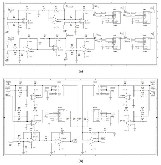 Detailed circuit implementation of the LMI-Fuzzy Control. (a) Circuit diagram for the calculate membership functions and normalized weights. (b) Circuit diagram for the calculate total T-S fuzzy controller.