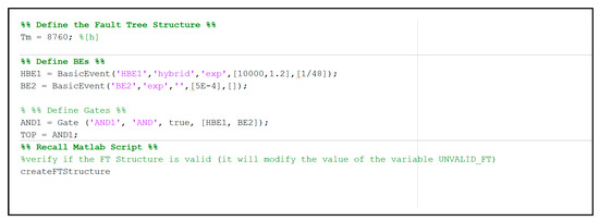 For further information, interested readers can refer to [23], which explains the main properties of each class and how to construct a SHyFTA model. The structure of the generic initFaultTree.m is shown in Figure 2. The main information to include in this script are the mission time and the events and gates constituting the fault tree.
