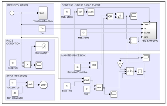 Table 3. Main elements of the “generic hybrid basic event” block. - The “stop iteration” (see Table 4) is the block that ends the iteration when the Top Event occurs, and the fault tree model is set for evaluating the system reliability. In fact, in that case, a failure of the Top Event cannot be reverted if a component is repaired.