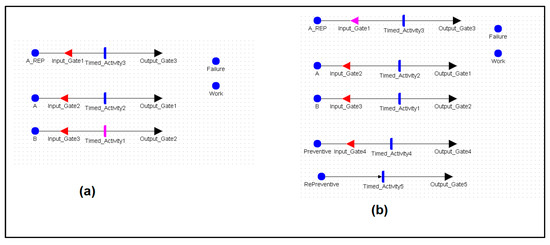 Stochastic Activity Network model of the AND Gate: (a) with corrective maintenance (2C) and (b) with preventive maintenance (2P).