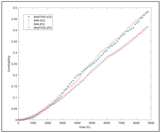 Figure 8 shows the results of the SHyFTA model of Figure 7b. In this case it is also possible to see that the preventive policy improves the system reliability. In particular, the policy 2P reduces the system unreliability from 8.74 × 10−3 to the value of 7.08 × 10−3. The policy 1P performs in between and presents a system unreliability of 8.05 × 10−3.
