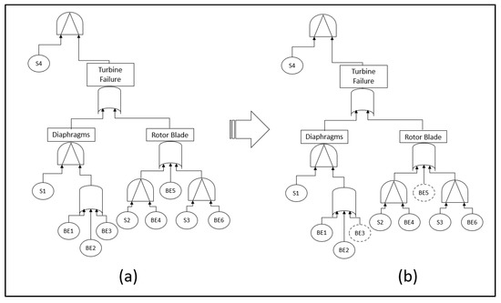 Figure 7a shows the Dynamic Fault Tree of the steam turbine, while Table 8 shows the main parameters of the system components [25]. As can be seen, the simplified model of the steam turbine, based on a FMEA, is characterized by the relevant failure modes that affect the functioning of the Diaphragms and the Rotor Blade. The condition monitoring depends on the sensors S1, S2, S3 and S4 which, respectively, monitor the status condition of the Diaphragms, of the Vibration faults, of the Steam Temperature and, lastly, of the Turbine.