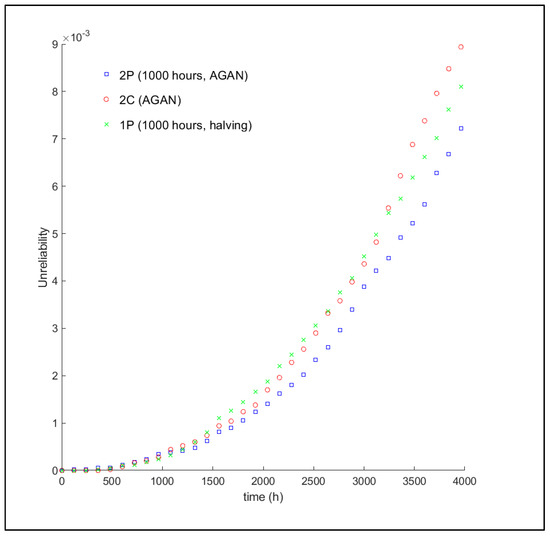 These results confirm that policy (2P), as expected, is the most effective maintenance strategy. It can be seen that the unreliability of the system is similar but, as soon the first preventive maintenance occurs (at 2000 h) the two groups of trends start to diverge. This is because every 2000 h the preventive maintenance replaces the component as new, restarting the aging to 0.