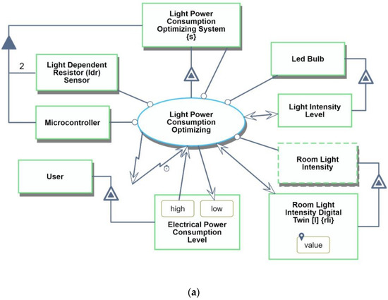 The beneficiary of the system is the User, whose Electric Power Consumption Level changes from high to low. As the system is completely automatic, the User does not need to be involve in its operation. The system is affected by Room Light Intensity—a physical and environmental object. In order to represent that our IoT system does not interact directly with the analog signal, we added its digital twin Room Light Intensity Digital Twin. The system runs in a loop periodically, e.g., every five seconds, as expressed by the self-invocation of the main process with the clock symbol.