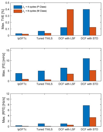 The bar diagram in Figure 2 shows the maximum TVE, |FE| and |RFE| values computed over all data records and associated with the IpDFTc algorithm, the tuned TWLS estimator and the DCF technique using either the LSF or the STD filter, respectively. Given that, as shown in Section 3 and Section 4, the best results as well as the full compliance of some algorithms are obtained over 4-cycle intervals in the P Class case and over 8-cycle intervals in the M Class case, respectively, the results obtained over 2-cycle and 6-cycle intervals are omitted here for the sake of brevity. Moreover, the TVE, |FE| and |RFE| values obtained over 2 cycle intervals are very large due to the large spectral leakage caused by the 2nd and 3rd harmonic.