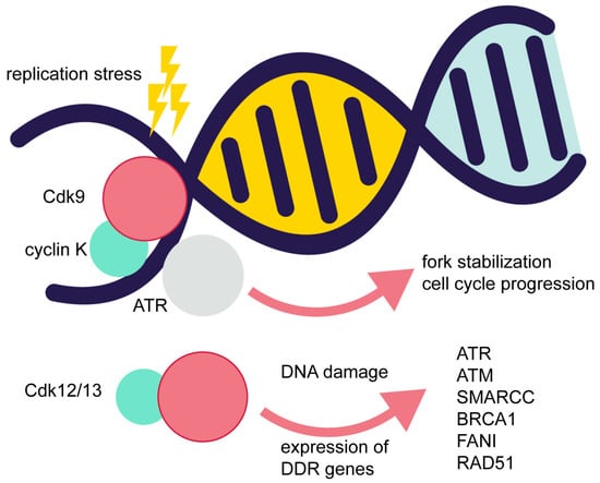 During the replication stress, the cyclin dependent kinase 9 (Cdk9) accumulates on chromatin and reduces the amount of single-strand breaks. Cdk9 in complex with cyclin K interacts with ataxia telangiectasia and Rad3-related protein (ATR) and other damage response proteins and provides genome stability. In the presence of DNA damage, cyclin K/Cdk12/13 complexes induces the expression of DNA damage response genes.