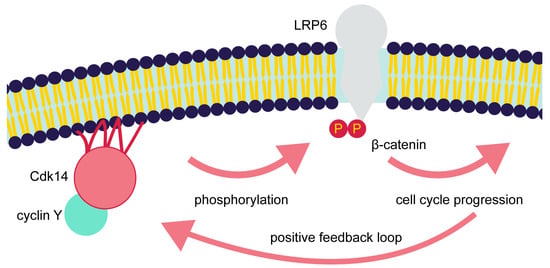 Cyclin Y in normal cells along with Cdk14 influences the transduction of signals in the Wnt pathway by phosphorylation of low-density lipoprotein receptor-related protein 6 (LRP6) (Figure 4). Davidson et al. showed that the complex of cyclin Y with Cdk14 through phosphorylation of LRP6 prevents the degradation of β-catenin, which allows the signal transmission. Wnt receptor phosphorylation and signaling reach the maximum level in the G2/M phase, so as the expression of cyclin Y, which may suggest a relationship between these two elements [110].