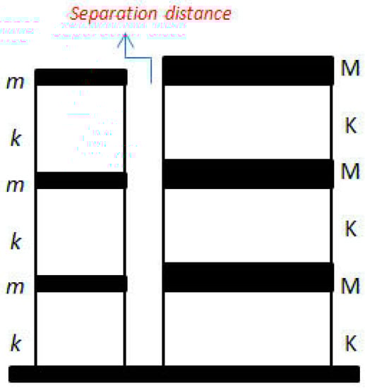 Evaluation of the best prediction of the required separation distance between two adjacent buildings during ground motion was carried out by using the lumped mass multi-degrees of freedom models of structures (see Figure 2). The structural bases were considered to be fully fixed to the ground and the soil–structure interaction effects were not taken into consideration. The damping ratio of the analyzed three-story buildings was assumed to be equal to 5% and modeled using Rayleigh’s damping. It was assumed that each model is able to capture vibrations in all directions under seismic excitation. However, the longitudinal direction was considered to be the main one and the results estimated for different cases were directly compared with each other for this direction. In the study, the height of each story of the buildings was assumed to be equal to 3.00 m and the plan of the structure was considered to be square. Table 1 shows the properties of different models used in the analyses.