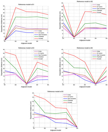 Numerical analysis was conducted for five different earthquake records, i.e., for the El Centro (1940), Parkfield (1966), San Fernando (1971), Kobe (1995) and Kocaeli (1999) earthquakes—see Table 2. It was assumed in the analysis that the direction of ground vibrations during each earthquake (see components in Table 2) is convergent with the longitudinal direction defined for adjacent buildings. It should be added that the influence of the direction of ground vibrations can be taken into account by considering two horizontal components of each earthquake (usually NS and EW) and defining different layout angles for adjacent structures in relation to these horizontal directions. In the first stage of the investigation, all five structural models were analyzed individually. As the result of this analysis, the top story maximum lateral displacement for each model was determined under various ground motions (see Table 3). It can be seen from Table 3 that the largest maximum lateral displacement (equal to 36.18 cm) was observed for model B1 under the Kocaeli earthquake record, while the lowest value (equal to 2.95 cm) was determined in the case of model B4 under the San Fernando earthquake.