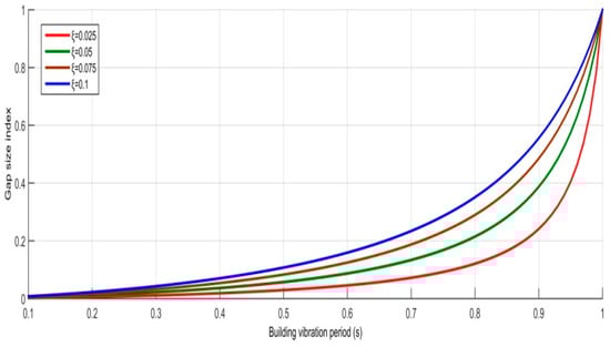 An example of the limitation of the gap size index with different damping ratios for Tj = 1 s, calculated using Equation (10), is presented in Figure 5.
