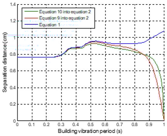 After substituting Equation (9) or Equation (10) into Equation (2), the formula for the separation distance between adjacent buildings preventing their pounding during a specified ground motion is obtained. The comparison between the separation distance based on Equation (1) and on two variants of Equation (2), calculated for the Kobe earthquake for Tj = 1 s and different values of Ti, is shown in Figure 6. It can clearly be seen from the figure that all three formulas are quite accurate when both buildings have different (substantially different) natural vibration periods. On the other hand, when two structures have natural periods close to one another, Equation (1) shows substantially different results. In particular, for the case when Ti = Tj, the separation distance calculated by Equation (1) is equal to 1.08 cm, whereas the correct value equal to zero is obtained for both formulas based on Equation (2).