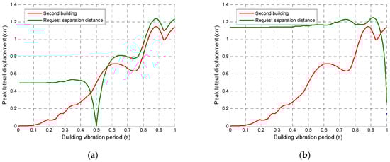 The lateral displacement time histories of buildings separated by the seismic gap, calculated by using Equation (2) and (a) Equation (9) or (b) Equation (10).