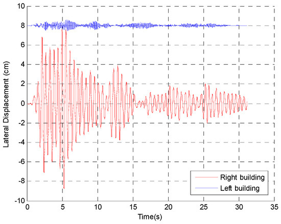 The lateral displacement time histories of buildings separated by the seismic gap of 7.98 cm.