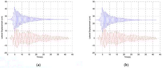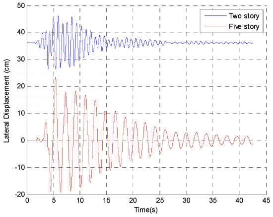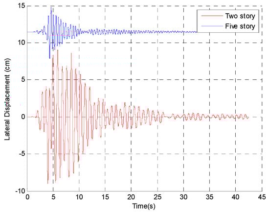 where , and are the lumped mass, stiffness and damping ratio of the i-th story of a j-story building, respectively, whereas denotes the natural vibration period of a j-story structure. The maximum lateral displacement under the Parkfield earthquake was determined as equal to 9.17 cm for the two-story building and 7.08 cm for the five-story structure. The required separation distance was calculated using Equations (2) and (10) as equal to 11.47 cm. The story displacement time histories at the level of the second story, separated by this gap size, are shown in Figure 10. It can be seen from the figure that the structures do not collide during the whole time of the seismic excitation.