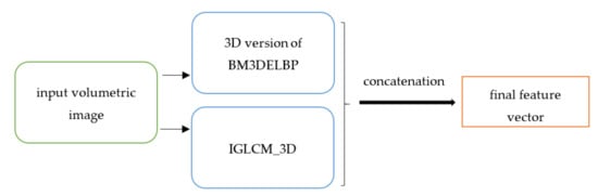 The proposed method covered in the article extends our prior contributions validated in the two conference papers [28] and [29] by fusing the two results and provides a complex means of feature description in 3D. In [28], we proposed the 3D version of BM3DELBP (BM3DELBP_3D) whose feature space is constructed based on the signs of differences between neighbouring pixels without any information regarding the amount of difference such as the contrast or degree of homogeneity in the analysed image. This knowledge is captured by the Improved 3D Gray-Level Co-Occurrence Matrix (IGLCM_3D) introduced by us in [29]. Following, the proposed approach described by the current paper aims at the combination of the two types of texture features in order to increase the discrimination power. Figure 3 summarizes the feature extraction process of the proposed technique.