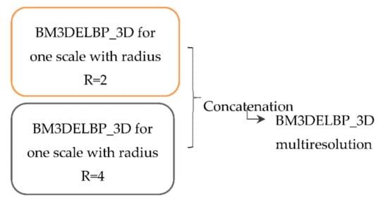 For each 3D input image, the BM3DELBP codes are extracted separately from each of the three orthogonal planes XY, XZ and YZ. As the input image is a cube, for each plane, there are several image slices. The BM3DELBP operator is thus applied separately on each slice of each plane. For each slice, the BM3D denoising technique is applied and then, by considering the responses to the applied filter, the three components of the BM3DELBP operator are computed: BM3DELBP_CI, BM3DELBP_NI and BM3DELBP_RD. The feature vector corresponding to one orthogonal plane results from the concatenation of the histograms obtained for each volumetric component. A multiresolution strategy is used to attain a degree of invariance to the change of the observation scale based on the same strategy described in Section 2.2. Two scales were considered given by their radius: R = 2 and R = 4, respectively. In [22], four scales were used for 2D image classification. Since we deal with volumetric images and the computation complexity is challenging, we proposed reducing the number of scales to two in order to minimize the feature vector size and to avoid the classic curse of dimensionality problem. Figure 5 presents the considered multiresolution strategy for the 3D case.
