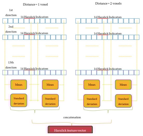 The 3D GLCM is computed from the quantized image by considering the image intensities information of the input volumetric cube. The number of quantization levels is , chosen as a trade-off between time efficiency and loss of data. The considered directions are all 13 independent directions provided in Table 2 and the considered distances are: 1 voxel and 2 voxels, respectively. The GLCM matrix is generated for all considered orientations and distances, resulting 26 matrices (13 directions × 2 distances). All matrices are normalized. The computed GLCM does not constitute the feature vector, it is just a tool used to compute different statistical indicators. For the GLCM matrix, 14 Haralick indicators [27] are determined: energy, entropy, correlation, contrast, homogeneity, variance, sum average, sum entropy, sum variance, difference entropy, difference variance, information measures of correlation 1 and 2 and the maximal correlation coefficient. They are computed for each of the 26 obtained matrices. The Haralick feature vector (GLCM feature vector) is obtained by considering the block scheme from Figure 7.