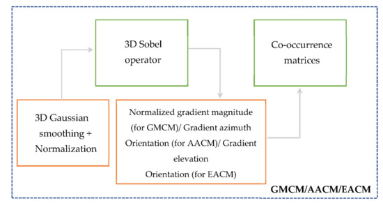The three co-occurrence matrices are based on the gradient image. In order to prevent the detection of false edges caused by noise, we employ a 3D Gaussian smoothing filter. The considered parameters for this filter were chosen as a trade-off between noise elimination and attenuation of edges: the size of the kernel is of 5 × 5 × 5, the mean of the 3D Gaussian function is 0 and the standard deviation is . For preventing illumination changes, a normalization is performed at the end of this step.