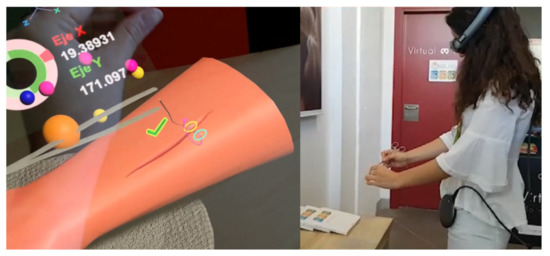 At this point, phase III starts and two interactive objects are projected onto the user’s hands: the tweezers and the needle holder. In this last phase, the tool must enable realistic user interaction with the virtual arm. To this end, we promote a motor coordination movement based on the activation of the trigger points to complete the suture procedure (see