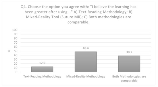 Figure 7). Note that 48% of those surveyed consider that their learning has been greater through using Suture MR, 38.7% consider that both methodologies are comparable, and the remaining 12.9% indicate that they have learned more by following the traditional methodology (see