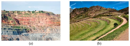 Examples of using berms in real world slopes: (a) Slopes with berms in coal mine areas (Dr Ajay Kumar Singh/Shutterstock.com); (b) slopes with berms in Peru (lialina/Shutterstock.com).