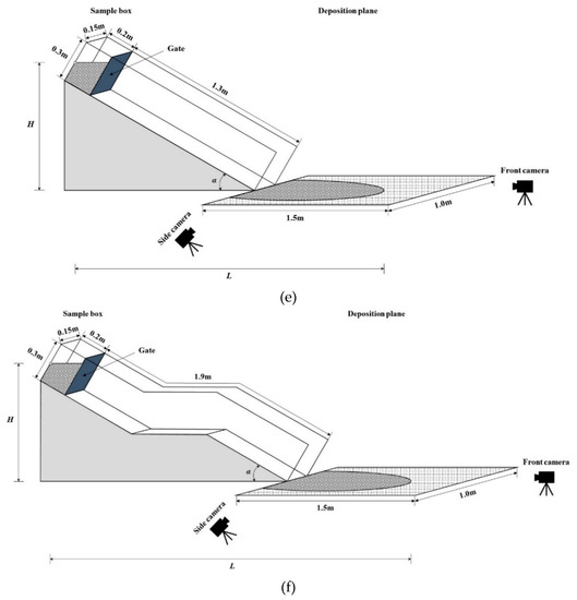Figure 2 shows the experimental setups and main parameters of the flume experiments performed in this study. Here, H is the total drop between the initial occurrence and final deposition points of the debris flow, L is the total travel distance. The setup for the flume experiments was composed of a sample box, a channel, and a deposition plane. The sample box was 0.2 m long, 0.15 m wide, and 0.3 m high, and installed at the top of the channel. The sediment–water mixture was supplied to the channel by manually lifting the gate of the sample box. The channel was made of steel in consideration of the strong erosion that accompanies debris flow, and had a length of 1.3–1.9 m, a width of 0.15 m, and a height of 0.3 m (Table 2). The channel was fabricated in separate upper and lower slope segments so that a 0.6-m long berm could be installed between them. At the outlet of the channel, a 1.5-m long, 1.0-m wide deposition plane was installed to analyze the debris flow deposition characteristics. The deposition plane was composed of 0.05-m grids in the longitudinal and lateral directions.