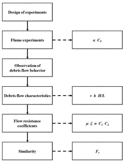 To effectively design debris flow mitigation measures, it is necessary to first calculate the main debris flow parameters, such as the potential debris volume, impact force, flow velocity, peak discharge, mobility ratio, runout distance, and total travel distance [16,21]. In particular, the flow velocity must be considered in the design of any debris flow mitigation measure because it directly influences the impact force and deposition characteristics, and is affected by the channel topography [3,15,22,23]. In the countries where studies on debris flow characteristics have been actively conducted, the debris flow process and impact force can be estimated relatively accurately [10,21,24]. Domestic studies on debris flows in South Korea, however, have been limited to trend analyses for simple experimental conditions. Numerical analysis, field observations, and flume experiments have all been previously used for research into the behavior and mechanism of debris flows. Numerical analyses provide relatively high accuracy, but it is difficult to obtain the necessary parameters through field observations, and as such, the observational data required to verify the results of such analyses are insufficient [2]. Thus, while field observations and numerical analyses are suitable for developing and testing methods to predict the behavior of debris flows, flume experiments are more suitable for conducting research on the behavior of debris flows under controlled conditions to develop related prediction equations [8]. Indeed, flume experiments are the only available method for identifying the flow and deposition characteristics of debris flows through repeatable experiments with reproducible results [25]. For these reasons, flume experiments have been mainly used in the past to identify the behaviors of debris flows.
