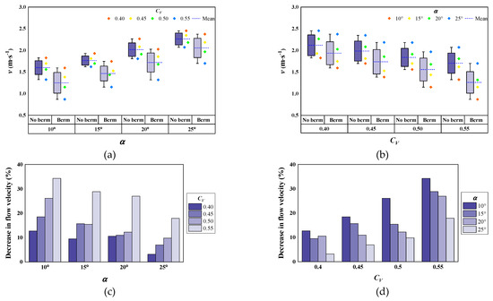 (a) Flow velocity according to α (at CV = 0.40–0.55); (b) flow velocity according to CV (at α = 10°–25°); (c) percent decrease in flow velocity due to berm according to α (at CV = 0.40–0.55); (d) percent decrease in flow velocity due to berm according to CV (at α = 10°–25°).
