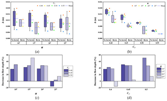 (a) Flow depth according to α (at CV = 0.40–0.55); (b) flow depth according to CV (at α = 10°–25°); (c) percent decrease in flow depth due to berm according to α (at CV = 0.40–0.50); (d) percent decrease in flow depth due to berm according to CV (at α = 10°–25°).