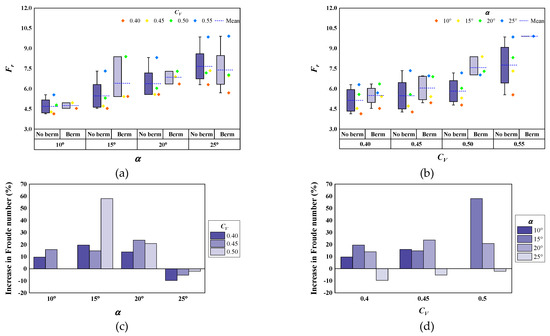 (a) Froude number according to α (at CV = 0.40–0.55); (b) Froude number according to CV (at α = 10°–25°); (c) percent increase in Froude number due to berm according to α (at CV = 0.40–0.50); (d) percent increase in Froude number due to berm according to CV (at α = 10°–25°).