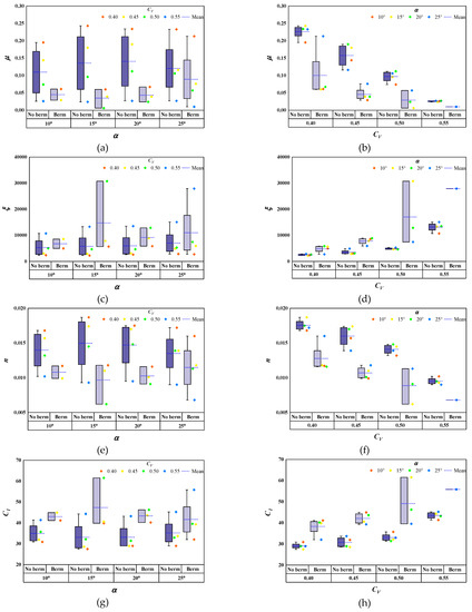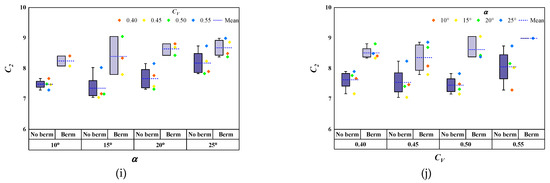 Table 7 shows the ranges, mean values, and standard deviations of the flow resistance coefficients μ, ξ, n, C1, and C2 calculated using Equations (2)–(6) based on the experimental results in this study. Figure 9 shows the experimentally obtained flow resistance coefficient values according to α and CV. The experimental results showed that α had little influence on any flow resistance coefficients (Figure 9a,c,e,g,i), but CV clearly affected all flow resistance coefficients except C2 (Figure 9b,d,f,h,j): As CV increased, the values of μ and n decreased, whereas the values of ξ and C1 increased. When the berm was installed, the values of ξ decreased by 4.3% when α was 25° and CV was 0.40. Except for this one observation, each flow resistance coefficient exhibited a consistent change pattern due to the installation of the berm. The installation of the berm decreased μ by 8.6–93.8%, increased ξ by up to 563%, decreased n by 7.0–57.2%, increased C1 by 10.6–91.4%, and increased C2 by 2.9–26.4%.
