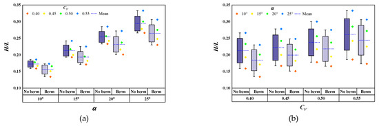 Table 6 shows the debris flow velocity, flow depth, Froude number, total travel distance, and mobility ratio observed through the flume experiments, where N is the experiment number. In the case of the straight channel test, the development of debris flow was insufficient to observe the flow depth when α was 10° and CV was 0.60; however, debris flow was sufficiently developed when α was 15° or greater. In the single-berm channel test, debris flow stopped in the channel when CV was 0.60, regardless of α, so these values are not reported in the analysis below. In addition, when α was 20° or less and CV was between 0.50 and 0.55, the development of debris flow was insufficient to observe the flow depth in some experiments.