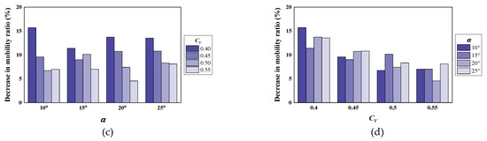 (a) Mobility ratio according to α (at CV = 0.40–0.55); (b) mobility ratio according to CV (at α = 10°–25°); (c) percent decrease in mobility ratio due to berm according to α (at CV = 0.40–0.55); (d) percent decrease in mobility ratio due to berm according to CV (at α = 10°–25°).