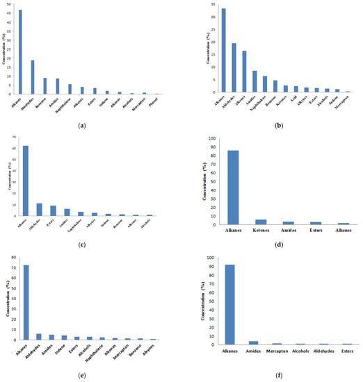 Figure 3a–c, it can be seen that the percentages of alkanes and aldehydes were the highest, which indicates that alkanes and aldehydes were the most important types of VOC pollution in nursery pigs and should be paid attention to because those were of great significance for understanding emission characteristics of the VOCs in the nursery piggeries. The content of alkanes in the chicken house was the highest, and alkanes were the main type of VOC pollution in the chicken house. It can be noted from