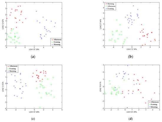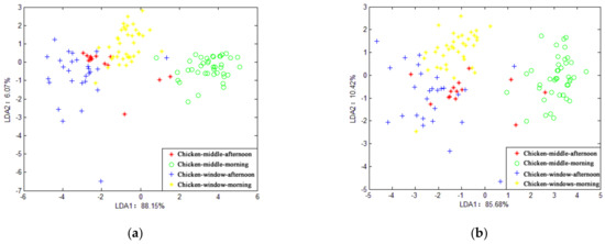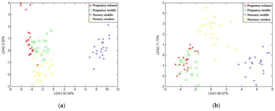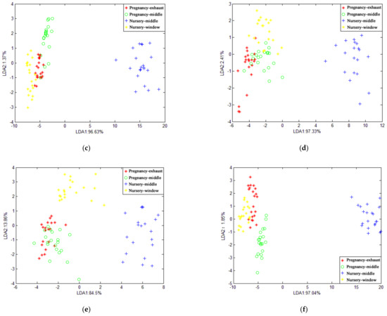 Figure 7 shows the recognition of gases in different spaces of the piggery by LDA when the average value and the maximum value of the features were selected, respectively. The cumulative contribution rates of the first and second discriminant factors in