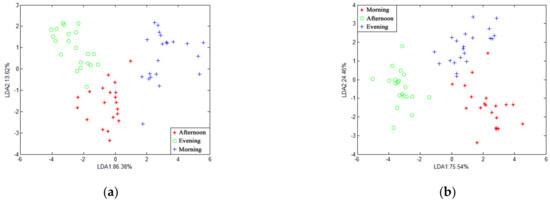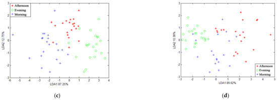 Figure 6 show the LDA of gas at different times in the piggery when the features were at the average value and the maximum value. The cumulative contribution rate of the horizontal and vertical coordinates was 100%, which can fully represent the characteristics of sample information. When the features were at an average value, only the nursery-window-morning overlapped. When the features were the maximum value, they more or less overlapped in the three periods of gas. In summary, LDA is more suitable for piggery gas identification when the features are at average values.