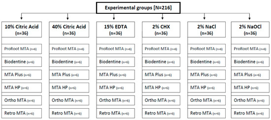 Six sample groups were used, each containing six materials: Biodentine, ProRoot MTA, Retro MTA, Ortho MTA, MTA Plus, MTA Repair HP (Figure 1). The number of samples was based on a sample size calculation, performed in G*Power 3.1.9.7. software. All materials were prepared in accordance with the manufacturer’s instructions (Table 1). The samples were formed into cylindrical specimens of 4.62 mm diameter and 2 mm height using a sterile catheter and stored at 37 °C and 100% humidity for the time required to achieve setting of the materials. After 24 h, the samples were randomly immersed in 10% CA (Cerkamed, StalowaWola, Poland), 40% CA (Cerkamed, StalowaWola, Poland), 15% EDTA (Cerkamed, StalowaWola, Poland), 2% NaOCl (Cerkamed, StalowaWola, Poland), 2% CHX (Cerkamed, StalowaWola, Poland), or 0.9% NaCl (Fresenius Kabi, Warsaw, Poland) at 37 °C.