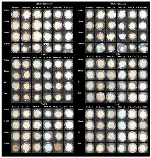 However, until now, no work on the influence of citric acid on CSCs has been published, nor have the effects of the aforementioned root canal irrigants on MTA Repair HP been studied. Thus, the aim of the present study was to investigate the effects of 10% and 40% CA in comparison to those of irrigation solutions such as 15% EDTA, 2% NaOCl, 2% CHX, and 0.9% sodium chloride (NaCl) as a control group on the color change of the CSCs Biodentine, ProRoot MTA, Retro MTA, Ortho MTA, MTA Plus, and MTA Repair HP.